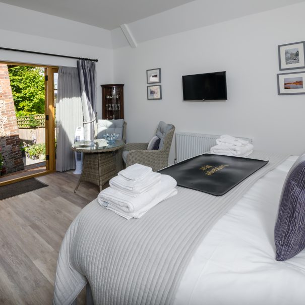 Sitting beside a row of Grade II listed cottages in Wepham, this newly built self catering lodge / studio in the South Downs has a lovely open plan style, comprising a main living area with zip-link super king bed, sitting dining area with flat screen TV, a separate well-equipped kitchenette, and a shower room. The stunning garden being the pride and joy of the owners, is shared with the guests and contains a a small secluded area reserved exclusively for guests. It is easily possible to walk directly from the garden to the George at Burpham, just a gentle stroll over the fields.